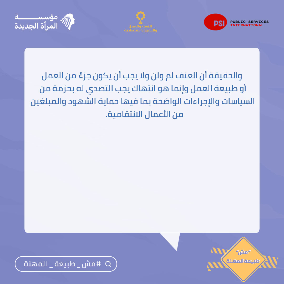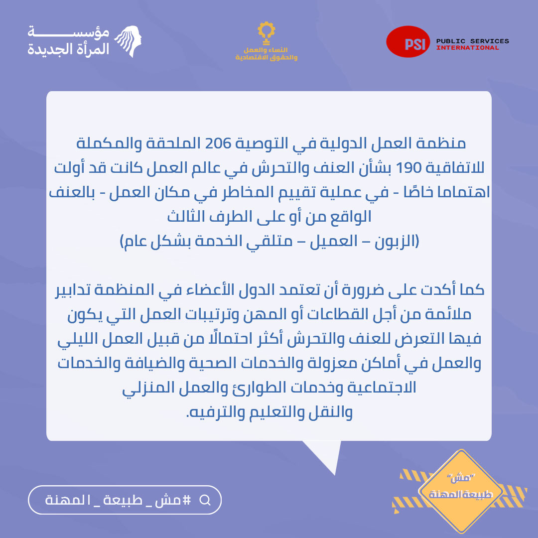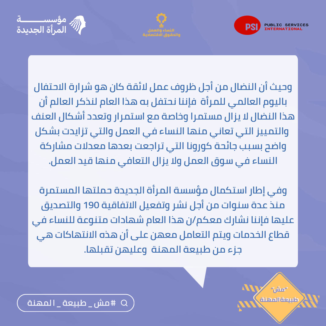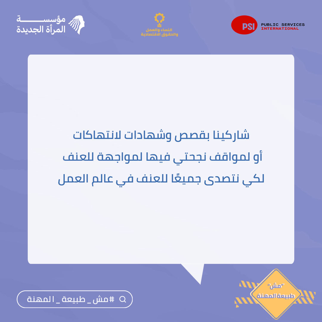 وفي إطار استكمال مؤسسة المرأة الجديدة حملتها المستمرة منذ عدة سنوات من أجل نشر وتفعيل الاتفاقية 190 والتصديق عليها، فإننا نشارك معكم/ن هذا العام شهادات متنوعة للنساء فى قطاع الخدمات، يتم التعامل معهن على أن هذه الانتهاكات هي جزء من طبيعة المهنة وعليهن تقبلها، والحقيقة أن العنف لم ولن ولا يجب أن يكون جزءا من العمل أو طبيعة العمل، وإنما هو انتهاك يجب التصدي له بحزمة من السياسات والإجراءات الواضحة بما فيها حماية الشهود والمبلغين من الأعمال الانتقامية.