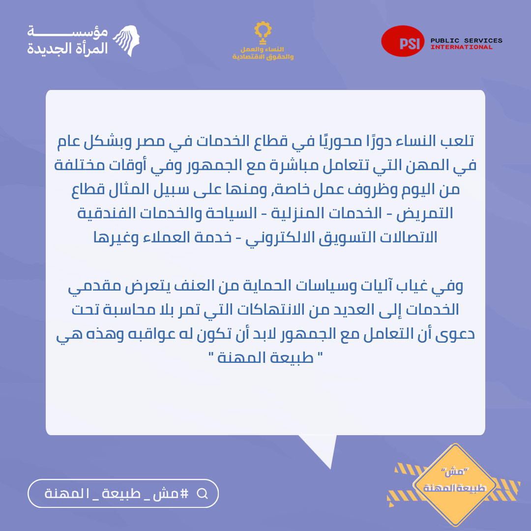 تلعب النساء دورًا محوريًا في قطاع الخدمات في مصر وبشكل عام في المهن التي تتعامل مباشرة مع الجمهور وفي أوقات مختلفة من اليوم وظروف عمل خاصة، ومنها على سبيل المثال قطاع التمريض – الخدمات المنزلية – السياحة والخدمات الفندقية – الاتصالات – التسويق الالكتروني – خدمة العملاء وغيرها، وفي غياب آليات وسياسات الحماية من العنف يتعرض مقدمي الخدمات إلى العديد من الانتهاكات التي تمر بلا محاسبة تحت دعوى أن التعامل مع الجمهور لابد أن تكون له عواقبه وهذه هي “طبيعة المهنة”