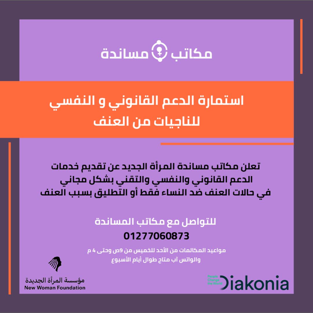 مكاتب المساندة هي واحدة من الخدمات التي تقدمها مؤسسة المرأة الجديدة ضمن مشروع “الحماية التشريعية لمواجهة العنف ضد النساء” والذي يتم بالتعاون مع هيئة دياكونيا